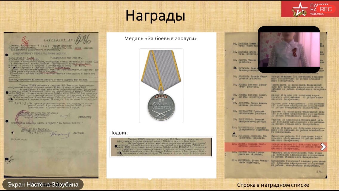«У прадедушки практически не осталось медалей, так как во время войны он использовал их как запчасти для машин, ведь в то время с запчастями было очень тяжело. 29 мая 1945 года прадедушку наградили медалью «За боевые заслуги», в наградном листе написано «За рационализаторские решения по ремонту машин, что увеличило их грузоподъёмность и скорость».