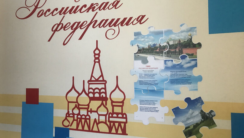 Для первоклассников – с коридора начальной школы, который так и называется «Родина большая». Слева на стене на уровне детских глаз – герб России. Девочки и мальчики обязательно разбирают с педагогами, что такое скипетр и держава, зачем нашему орлу две головы и одна корона и кто такой Георгий Победоносец.